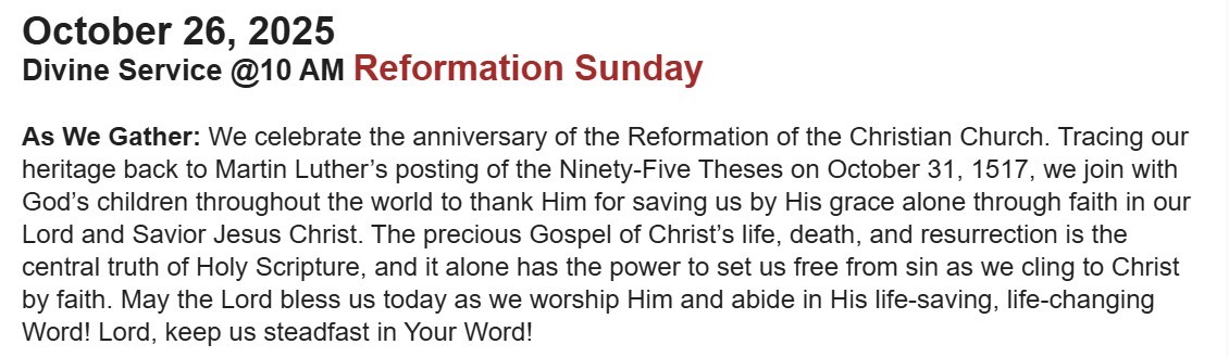 Music/Singing: Helga Danielson Hymns and Songs:Opening Hymn: “Salvation unto Us Has Come” LSB 555 (sts. 1,6,7,9,10) Hymn of the Day: “A Mighty Fortress Is Our God” LSB 657 Offertory Hymn: “Here I Stand” Distribution Hymns: “I Come, O Savior, to Thy Table”LSB 618 Distribution Hymns: “Lord, Keep Us Steadfast in Your Word” LSB 655 Distribution Hymns: “My Faith Looks Up to Thee”LSB 702 Nunc Dimittis: “Thy Strong Word” LSB 578 (sts. 1, 5) Click on the link below for our live streamed worship services: Grace Lutheran Livestream On YouTube Click on the link below to view the September calendar: September 2025 Calendar SERMONS Last Sunday’s Sermon: October 12: Benediction (Psalm 67) Click Here